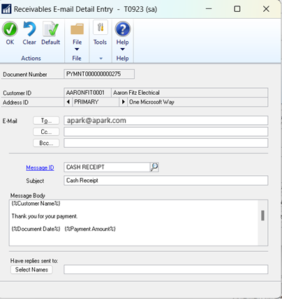 Microsoft has added enhancements to the Email Cash receipts functionality. They have added an icon at the top of your displays for Cash Receipts Entry/Inquiry, allowing you to easily email you cash receipts. When you click on the icon, the email detail entry will appear already filled in with the default email address and message ID for your client. Now, you can both update the customer email settings and assign the cash receipt for all of your emails at the same time in Report Template Maintenance.