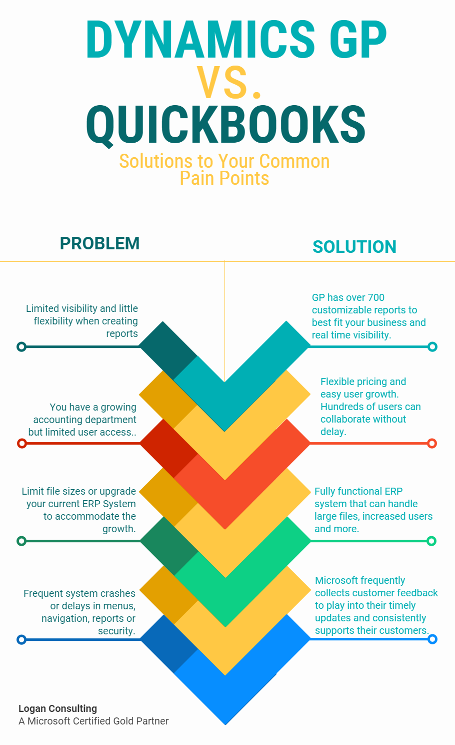 Solution: Dynamics GP offers a fully functional ERP system that can handle large files, increased users and much more. It offers dynamic functionality for a variety of industries.