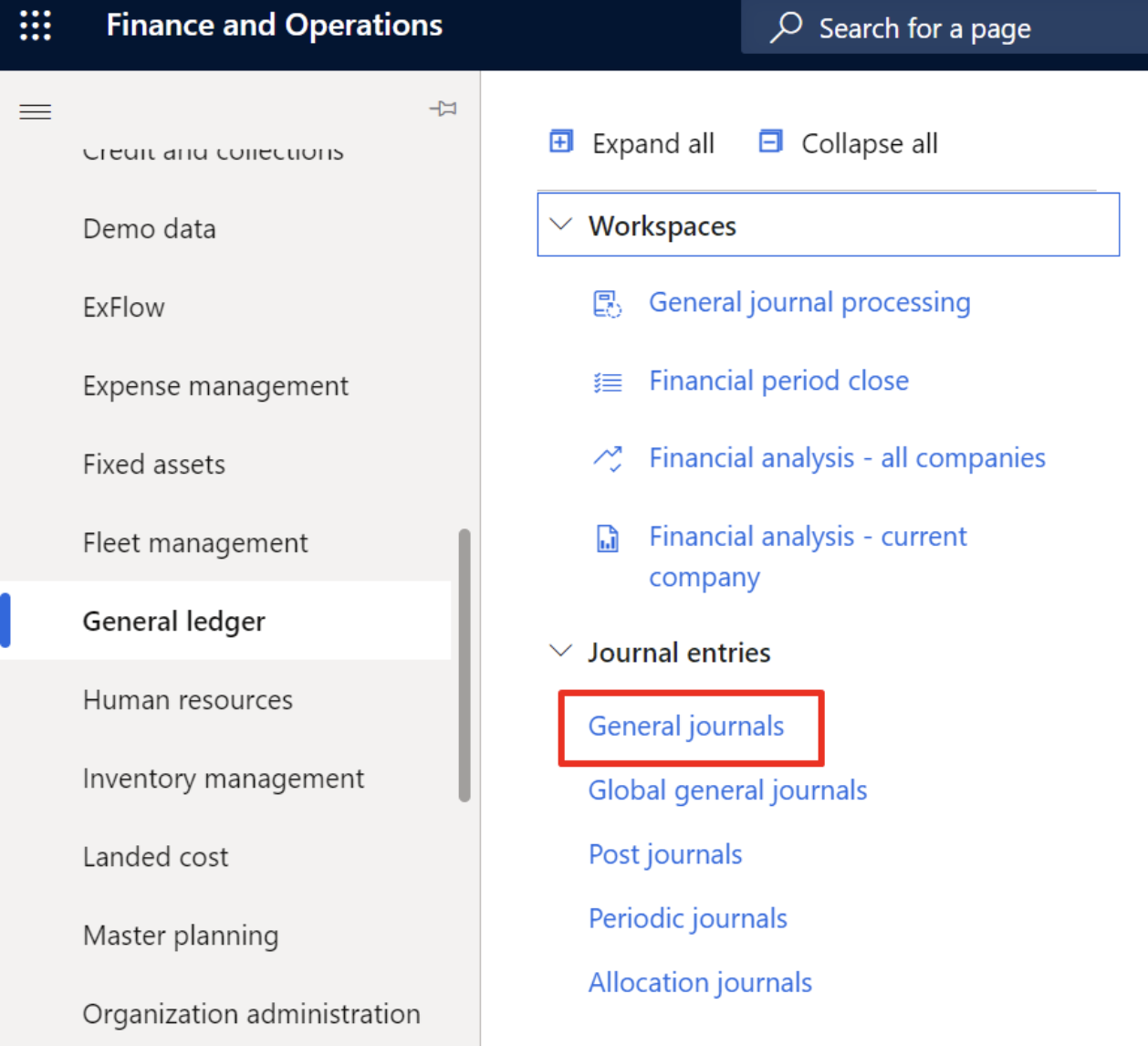 - Go to Navigation pane > Modules > General ledger > Journal entries > General journals.