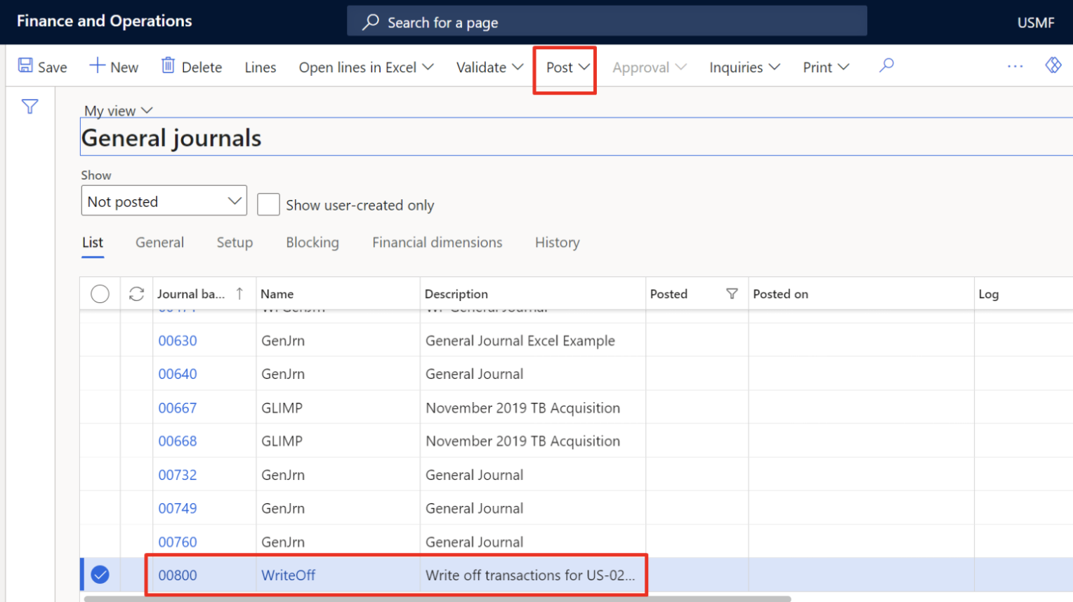 - Select the journal batch number for the journal that contains your write-off. One line is created to reverse the customer balance. One or more lines are created to post the write-off to the write-off account.