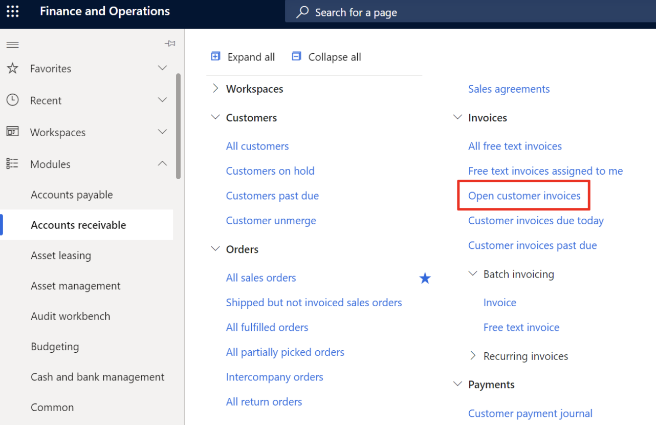 - Go to Navigation pane > Modules > Accounts receivable > Invoices > Open customer invoices.