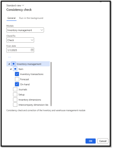 The Inventory Consistency Check can be run by navigating to System Administration > Periodic tasks > Database > Consistency Check. From there, you can filter to the Inventory Management Module and select Items > Inventory Transactions and On-hand. You can specify if you would like the system to Check for discrepancies or automatically Fix them. You can select a From Date that the job should check from.