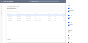 Landed costs can be applied to purchase and transfer orders, but this blog will focus on the purchase order side. The landed cost functionality provides accounting with appropriate tools that simplify the reconciling of costs related to overseas material. This specifically relates to the cost types that are setup as part of the configuration of the module. These cost types can be manually added to orders or come through as automatic costs based on a voyage, container, folio etc. The costs that are added can be viewed through the purchase order line by clicking Financials –> Cost inquiry. The first time you open the screen you will want to click the View button and toggle the information you would like to see. Otherwise, much of the information will be condensed to one or two rows.