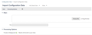 In the new environment navigate to Configuration Data and select Actions -> Import Configuration Data. Drag and drop or choose the zip file that was created in the previous step. The import can be set to process in the background or on the screen. For large datasets it is best to process in the background.