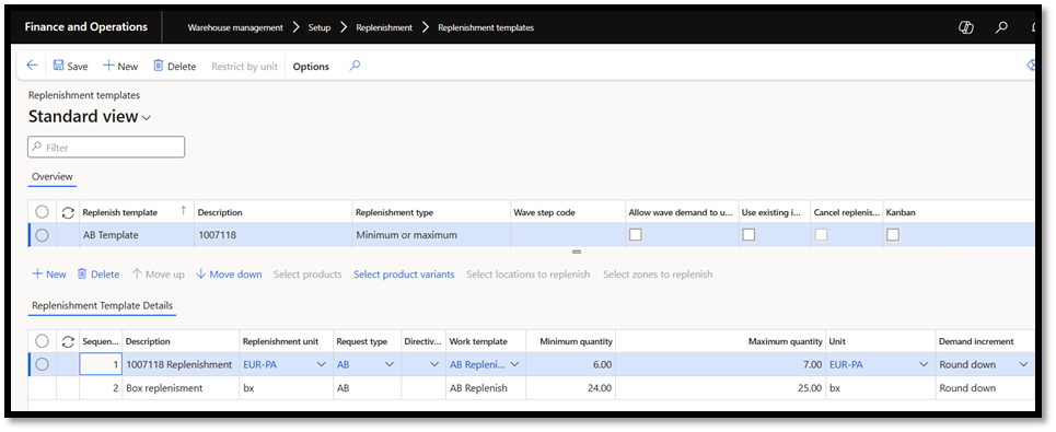 • Navigation: Warehouse Management > Setup > Replenishment > Replenishment templates.