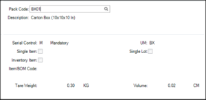 - Item Packaging Maintenance to define Item, Item-Customer, or Item-Customer-Transaction Type specific packaging requirements to set defaults when transacting an Item.