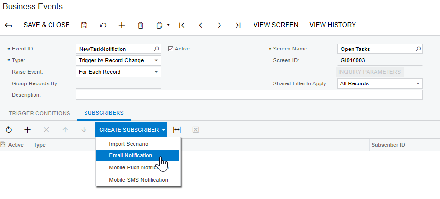 - Create a new business event. The raise event can be triggered by a record change or may run on a predefined schedule. In this example, we’re using a record change to prompt the business event. Choose your generic inquiry under Screen Name. Under the Trigger Conditions tab, choose the operation that defines how the data should have been changed for the condition to be met.