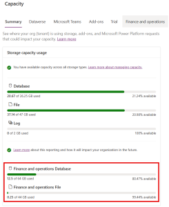 The report shows storage use at both the tenant level and the environment level (production, sandbox, etc.) via the “Capacity → Finance and Operations” tab in the Power Platform admin center.